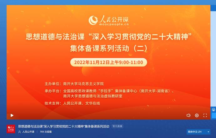 为深入学习贯彻党的二十大精神,推动党的创新理论最新成果融入高校“思想道德与法治课”的教学内容,2022年11月12日上午,买球体育官方网站思想道德与法治教研室全体教师在线参加了由南开大学买球体育官方网站主办、全国高校思政课教师“手拉手”集体备课中心南开大学思想道德与法治虚拟教研室承办的思想道德与法治课“深入学习贯彻党的二十大精神”集体备课会。会议分为两个主题,主题一由西南政法大学买球体育官方网站林峰副教授讲授“爱国主义的科学内涵及时代要求”,主题二由南开大学买球体育官方网站李星博士讲授“网络并非德外之地”。专家分别从这两个主题出发,将党的二十大精神融入思想道德与法治课程的教学内容中,并结合自己讲授思想道德与法治课程的教学工作分享了自己的教学经验。听完两位专家的主题交流之后,买球体育官方网站思想道德与法治教研室全体教师围绕思想道德与法治课专题教学、资源共享以及党的二十大精神融入课程教学设计等方面在线展开研讨和交流。
