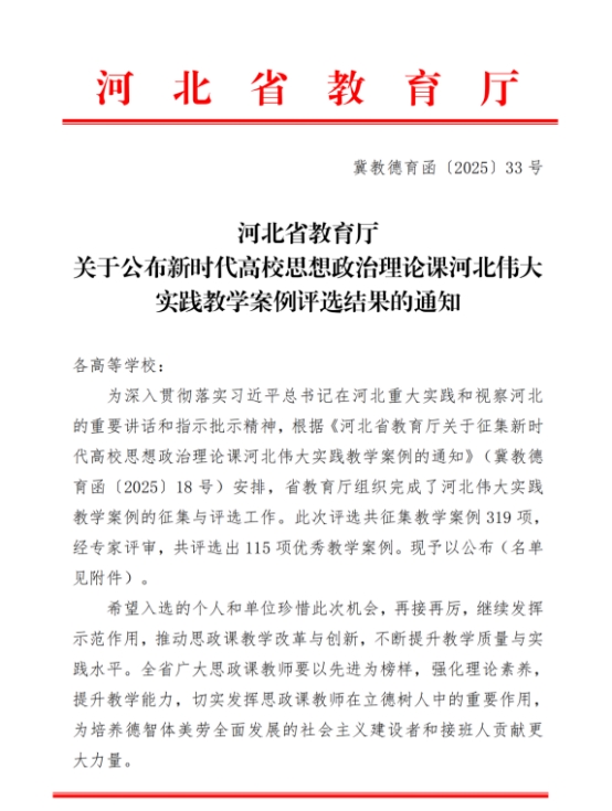 买球体育官方网站高度重视思想政治理论课建设,始终把提升思政课教学质量与育人实效作为核心任务,积极鼓励教师深入地方一线开展调研实践,挖掘河北红色资源、发展成就、先进典型等鲜活教学素材,推动思政课从 “课堂讲授” 向 “实践育人” 延伸,从 “理论灌输” 向 “价值引领” 转型。此次入选省级优秀教学案例,既是学院思政课教学改革成果的集中体现,也为后续教学工作提供了宝贵的示范经验。未来,学院将以此次获奖为契机,进一步加强思政课教学团队建设,持续深化教学改革创新,不断丰富实践教学内容与形式,着力打造更多高质量的思政教学案例,让思政课真正成为学生喜闻乐见、终身受益的 “金课”,为培养担当民族复兴大任的时代新人贡献更大力量。