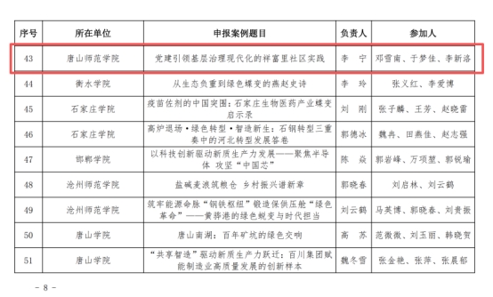 近日,河北省教育厅公布新时代高校思想政治理论课河北伟大实践教学案例评选结果,买球体育官方网站申报的教学案例成功入选。此次评选共征集教学案例319项,经专家评审,共评选出115项优秀教学案例。买球体育官方网站教师李宁、邓雪南、于梦佳、李新洛撰写的案例《党建引领基层治理现代化的祥富里社区实践》入选新时代高校思想政治理论课河北伟大实践优秀教学案例。