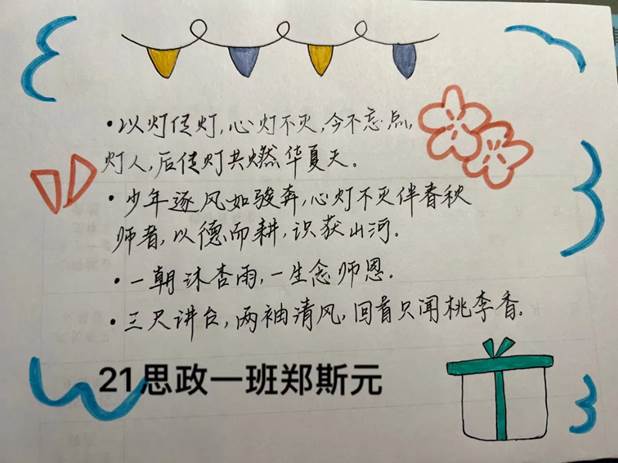 心怀皓月,感念师恩。9月10日,学院举办了“桃李共中秋,感恩向未来”送祝福活动。在送贺卡环节中,同学们以中秋为主题制作感恩教师、祝福中秋的贺卡,送给朝夕相处的老师,表达最真挚的感恩之情。独具匠心的贺卡加上情真意切的文字,是同学们献给老师最暖心的教师节礼物,架起了师生沟通的桥梁,“师恩难忘,师恩似海”、“祝所有老师节日快乐,身体健康”简单朴实的话语,表达了学生们对老师浓浓的敬意。