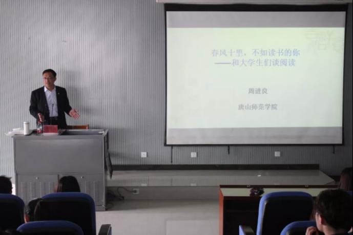 开幕式结束后,周进良教授为同学们进行了“春风十里,不如读书的你”为主题的讲座。周教授以自己亲身经历为例,为同学们讲授读书的意义所在。在场同学认真聆听,积极回答周教授的问题,此次开幕活动不仅让同学们对读书有了更深的理解,同时更加坚定了同学们对读书的信心。