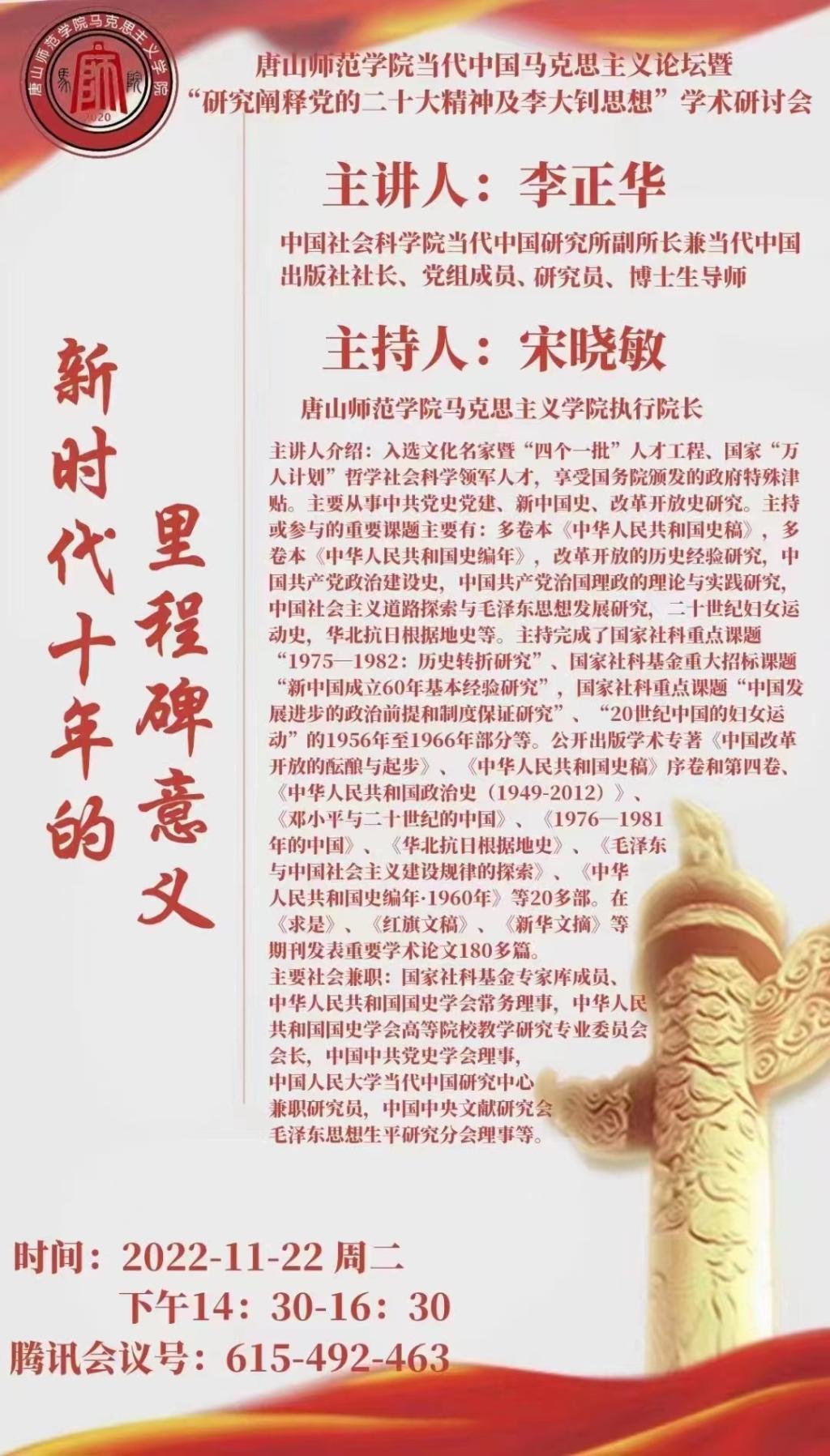 党的二十大是在我国迈上全面建设社会主义现代化国家新征程、向第二个百年奋斗目标进军的关键时刻召开的一次十分重要的大会。为深入学习贯彻习近平新时代中国特色社会主义思想和党的二十大精神,深化中国特色社会主义重大理论与实践问题研究,把握新时代十年来党团结带领全国人民的伟大成就和基本经验,进而提升买球体育官方网站的教学和科研能力,推进强国时代唐山师范学的更大发展,买球体育官方网站宣传部、买球体育官方网站、《买球体育官方网站学报》编辑部与中国社会科学院当代中国研究所联合举办代中国马克思主义论坛暨“研究阐释党的二十大精神及李大钊思想”学术研讨会。
