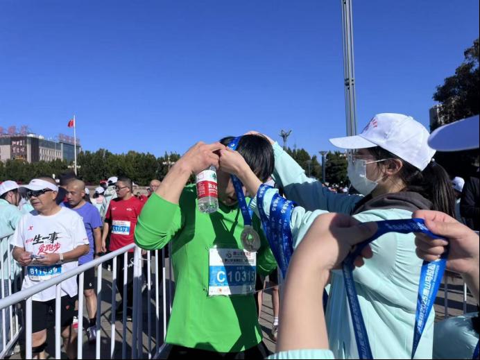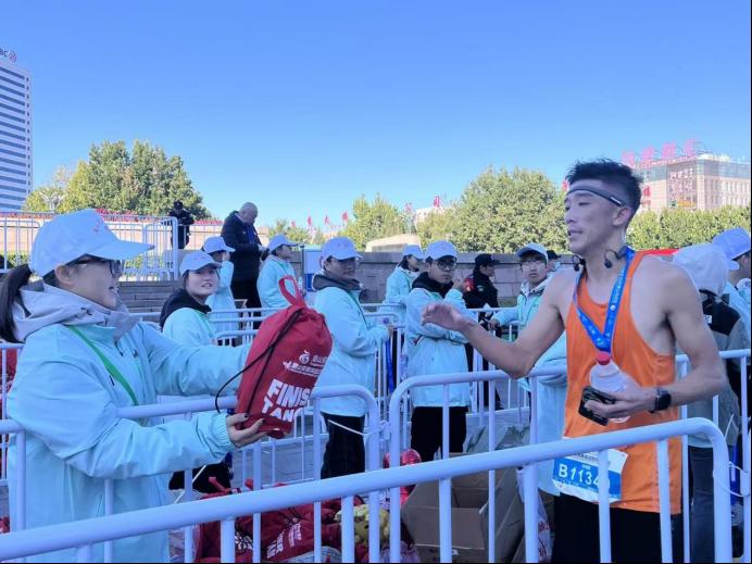 凌晨四点的唐山尚未破晓,志愿者已全员到岗积极投入准备工作。起点区域,他们高效完成参赛包分拣核对、物资分发与存衣服务,用细致周到的准备,为参赛者们构筑了赛事第一站;赛道沿线,补给站志愿者提前备齐能量胶、电解质饮料等物资,“加油,坚持住!”的暖心呐喊为奋勇争先的选手们注入无穷动力;比赛结束,志愿者将包含饮品、面包、香蕉和毛巾的补给包以及精美的奖牌精准交到选手手中;医疗岗志愿者与急救跑者协同联动,时刻监测选手状态,成为生命安全的“移动防线”。从停车指引、检录引导到赛后冰敷拉伸、成绩查询协助,各岗位志愿者们无缝衔接,用细致服务回应每位选手的需求。